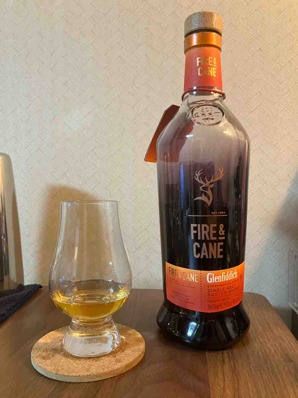 こんな超魅力的で興味深いボトル達に続くのがこのファイヤー&ケーンです。そのプレッシャーを跳ね除ける面白い個性があります。まず、グレンフィディックでは珍しくライトリーピーテッドモルトを使用したスモーキーな原酒が使用されています。また、バーボン樽で熟成後にカリビアンラム樽、南米産ラム樽で後熟。グレンフィディック21年も一部ラム樽熟成を行っているためグレンフィディックはラム樽と相性良いんですかね?熟成年数の表記はないNA品でアルコール度数は43度です。