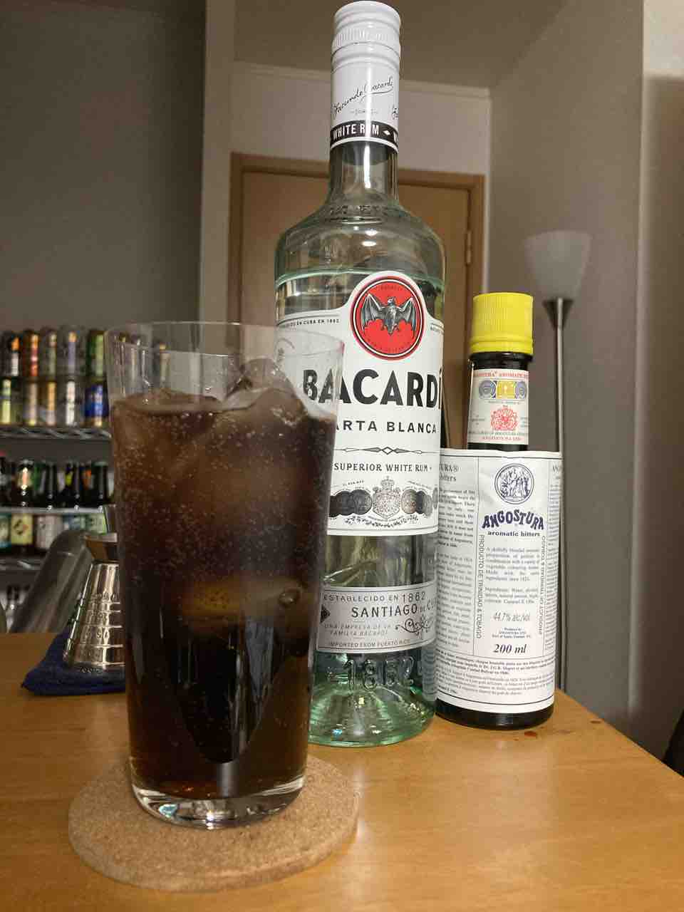 材料はラム酒とコーラで、カットしたライムを落とします。アロマティックビターを振りかけるのが好きです。